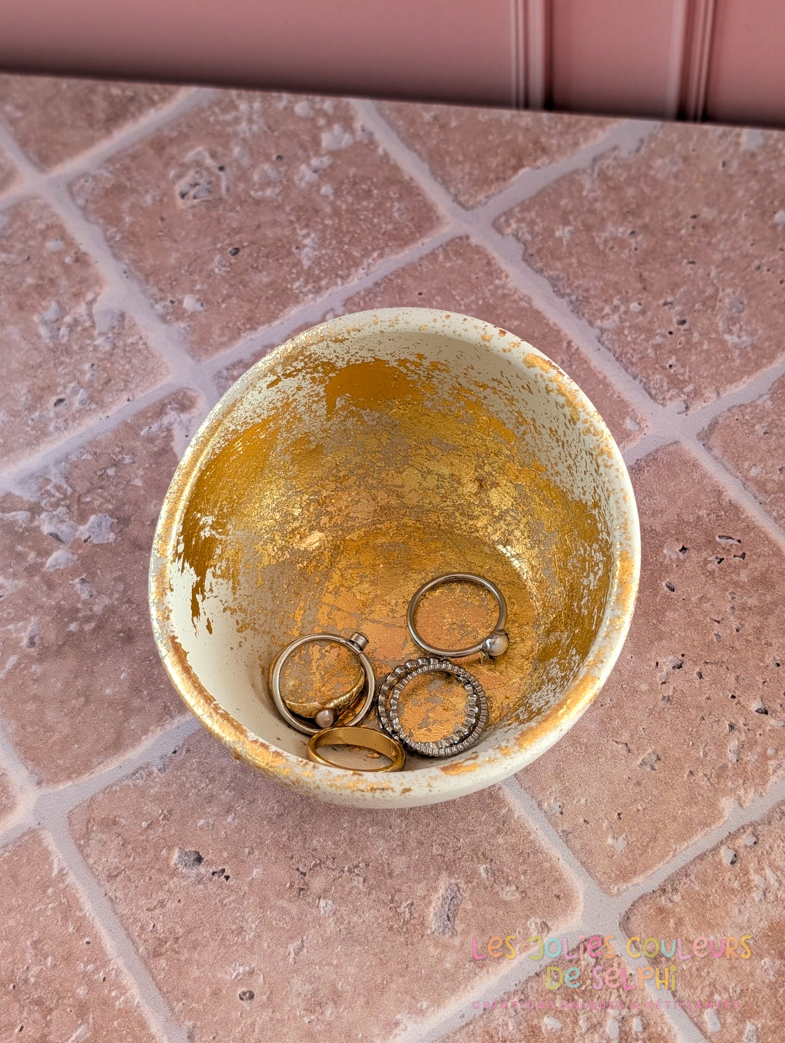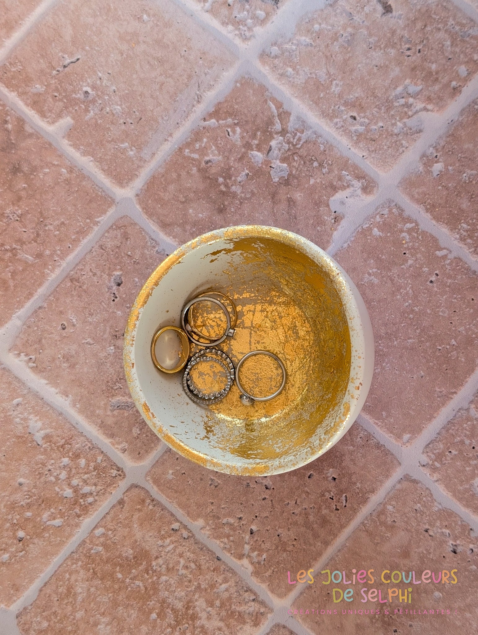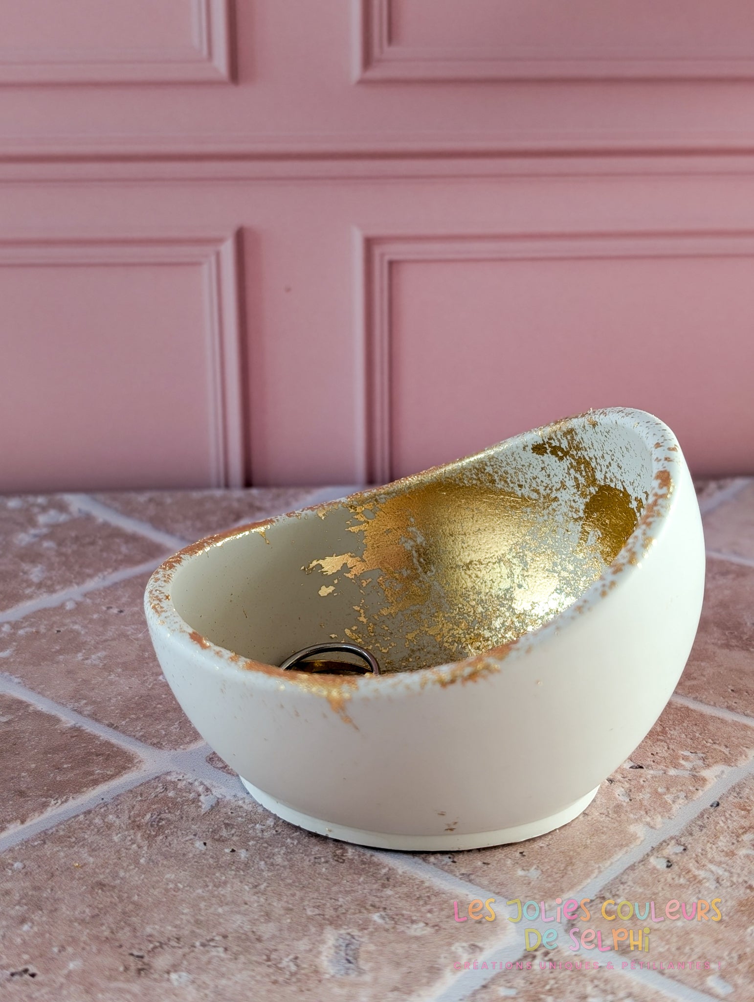 Cette coupelle a été réalisée à la main en Isère (38), en France, en Jesmonite, une résine écologique qui offre robustesse et aspect minéral. Son extérieur en blanc cassé mat contraste élégamment avec l’intérieur orné d’une dorure appliquée artisanalement, qui capte la lumière et apporte chaleur et éclat.