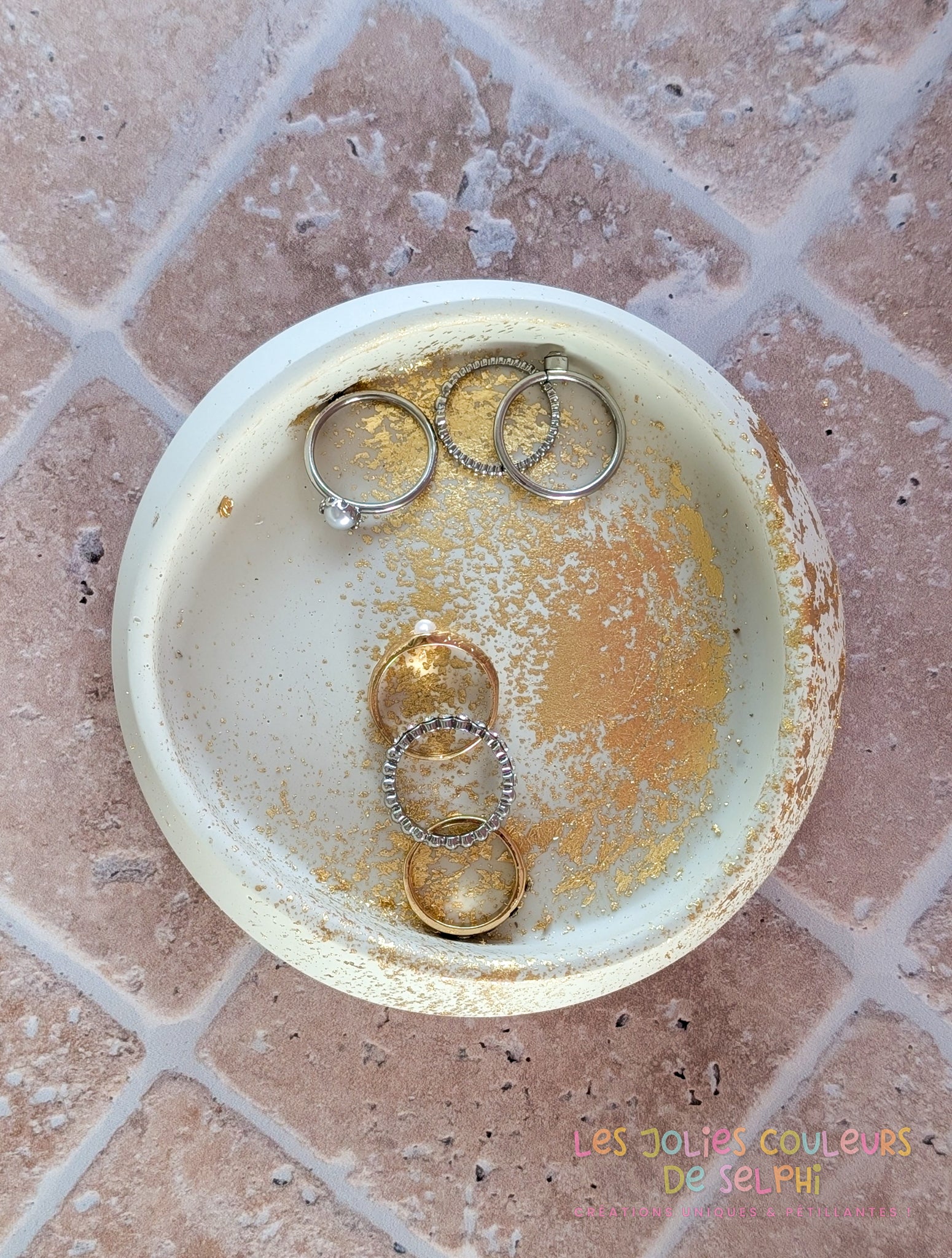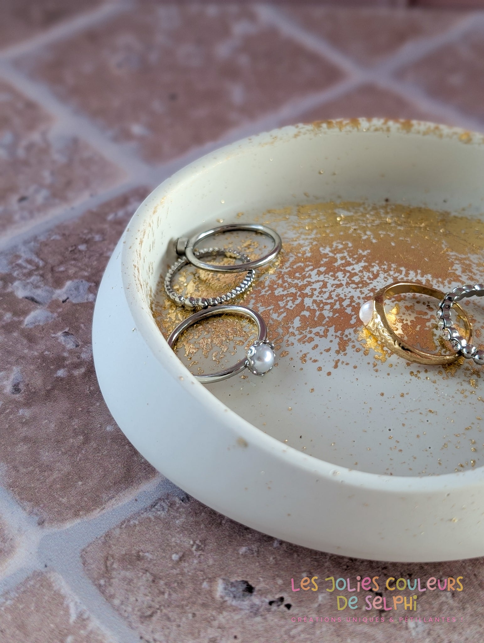 Cette coupelle arrondie est fabriquée à la main en Isère (38), en France, en Jesmonite, une résine écologique résistante au rendu minéral. Sa teinte blanc cassé / beige douce et naturelle est ponctuée de dorures appliquées artisanalement, offrant un contraste discret et raffiné.
