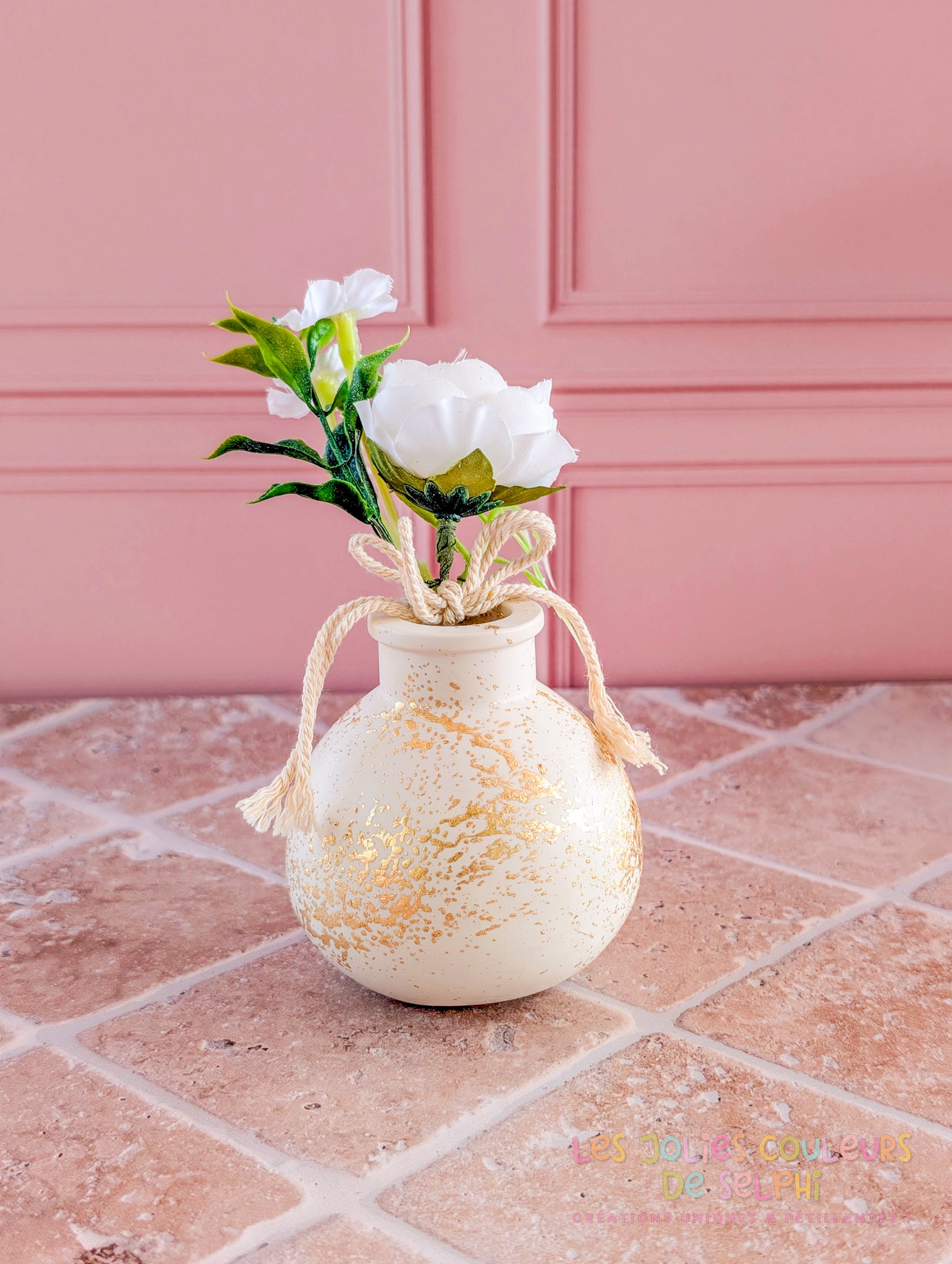 Ce vase a été réalisé à la main en Isère (38), en France, en Jesmonite, une résine écologique qui combine solidité et aspect minéral. Sa surface aux teintes douces blanc cassé / beige est rehaussée de dorures appliquées artisanalement, qui lui apportent éclat et élégance.